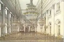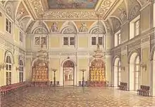 Following a disastrous fire which destroyed most of the Winter Palace's interiors in 1837, the halls were recreated in similar style by the architect Vasily Stasov.[1]