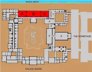 The Winter Palace's Neva enfilade is shaded red. A: Concert Hall; B: The Nicholas Hall; C: Great anteroom. 1:Malachite Drawing Room; 2: Arabian Hall; 3:Jordan Staircase; 4: Field Marshals' Hall; 5: Small Throne Room; 6: Armorial Hall; 7: Military gallery; 8: Great Throne Room; 9: Grand Church.