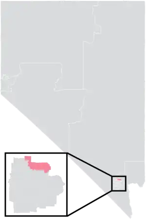 The district is entirely located within Nevada's 4th congressional district, and overlaps with the 1st and 17th districts of the Nevada Assembly.[5] It has a surface area of 48.5 square miles (126 km2) and a perimeter of 33 miles (53 km).[6]