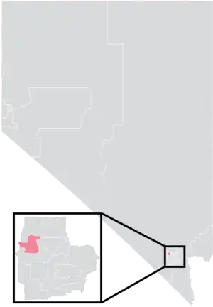 The district overlaps with Nevada's 1st, 3rd, and 4th congressional districts, and with the 34th and 37th districts of the Nevada Assembly.[4] It has a surface area of 25.9 square miles (67 km2), and a perimeter of 28.4 miles (45.7 km).[5]