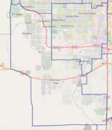 Originally, the 9th district was created after the 2000 census. It first stretched from Northwest Las Vegas into Enterprise and Southwest rural Clark County. The modern District 9 was drawn during a reapportionment after the 2010 Census.[26] The new districts became effective on January 1, 2012 for filing for office, and for nominating and electing senators, and for all other purposes on November 7 – the day after Election Day, when the new senator terms began. The area that the ninth senatorial district occupies is defined in the Nevada Revised Statutes using census tracts, block groups, and blocks.[27]