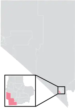 The district is located entirely within Nevada's 3rd congressional district, and overlaps with the 9th and 35th districts of the Nevada Assembly.[4] It has a total surface area of 63 square miles (160 km2), and a perimeter of 43.7 miles (70.3 km).[5]