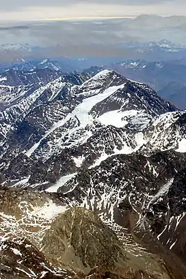 Nevado del Plomo, also spelled as Nevado El Plomo, is a mountain on the border between Argentina and Chile. Juncal Sur Glacier,[6] which feeds the Olivares River, descends the west side of the mountain. Nevado del Plomo is part of the Central Andes and has an elevation of 6,070 metres (19,915 ft) metres.[7] The Argentine portion is within the protection area of Tupungato Volcano Provincial Park. It is on the border of two provinces: Argentinean province of Mendoza and Chilean province of Cordillera. Its slopes are within the administrative boundaries of two cities: Argentinean city of Luján de Cuyo and Chilean commune of San José de Maipo.[8][7]