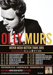 Never Been Better Tour was a concert tour by English singer Olly Murs. The tour supports his fourth studio album Never Been Better (2014) and was announced in November 2014. Originally, only a leg consisting of 14 shows in UK was planned, but due to high demand, the run was expanded with more dates, also in the rest of Europe.[1]