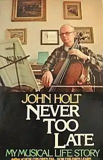 Never Too Late: My Musical Life Story, is a memoir written by John Caldwell Holt (1923-1985), an educator and author. The book tells about his experience of learning to play the cello as an adult. The book was published in 1979, six years before his death.