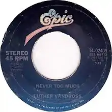 "Never Too Much" is the debut song written, composed, produced, and performed by Luther Vandross. The R&B song was released in 1981, as the lead single from Vandross's debut album of the same name. The title track hit number one on the US Billboard Hot R&B/Hip-Hop Songs chart, reached number four on the US Billboard Dance Club Songs chart, and peaked at number 33 on the US Billboard Hot 100.[1]