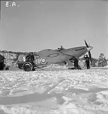 In the 1940 King's Birthday Honours, Isherwood was awarded the Air Force Cross.[3] In January 1941 Isherwood was posted to Fighter Command and was given command of a sector in No. 9 Group and later served as a controller at the group headquarters.[1][2] In August 1941 Isherwood was selected to command No. 151 Wing, which was being formed for a mission codenamed Operation Benedict, which was planned in the aftermath of Operation Barbarossa, the German invasion of the Soviet Union. The aim of Operation Benedict was to take two squadrons of Hawker Hurricane Mk IID fighters to defend the naval port of Murmansk in northern Russia and to train the Soviet Air Force to operate the aircraft, which would be the first of more than two thousand to be supplied.[4] Arriving on the first Arctic convoy at the beginning of September 1941, the wing established itself at an airfield at Vaenga (renamed Severomorsk in 1951). Besides training the Soviet pilots and ground crews, the wing claimed 15 enemy aircraft destroyed plus four "probables" and seven damaged, for the loss of one Hurricane in combat. None of the Soviet bombers that they escorted were lost.[5] At the end of October, when the wing had handed their last aircraft to the Soviets, they were ordered by the Air Ministry in London to travel south by rail through the Soviet Union for further service in the Middle East theatre. Isherwood compiled a lengthy signal stating that the journey was likely to take three months, that no rations or winter clothing were available and that there was a considerable danger of being overrun by the advancing Germans. The order was rescinded and the wing was evacuated by sea.[6] He was awarded the Distinguished Flying Cross for his service during the operation as well as the Order of Lenin.[7]