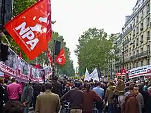 In December 2013, the Revolutionary Marxists faction in the Fourth International declared the Anticapitalism and Revolution current in the NPA and criticized the reformist orientation of the party.[9] In June 2021, almost 300 members of the Revolutionary Communist Current faction (Courante Communiste Révolutionnaire, CCR) left the party after being excluded from participating in the NPA congress and national conference, and the rejection of the pre-candidacy of CCR member Anasse Kazib as the NPA nominee for the 2022 French presidential election.[10]