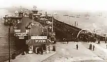 In 1892, a pavilion was added, described as a 130 feet (40 m) long covered saloon that was used for concerts and balls, among other events.[12] Passenger numbers from those landed by ferries for the year ending 31 March 1898 were over 2.7 million, which was an increase of over 300,000 from the preceding year.[14] The length of the promenade pier was extended to 660 feet (200 m) in 1900 so that it would reach the newly built promenade, which included a new pier entrance. In 1909–1910, the pavilion was refurbished, which included completely redecorating and installing a new heating system. On 16 March 1907, part of the landing stage collapsed which caused the pontoon to float down the river for some distance. The southern bridge also sustained significant damage and was replaced on 29 August 1907.[15]