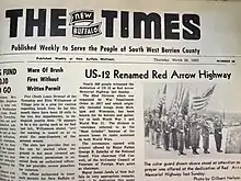 The New Buffalo Times was founded by Vilma Roumell in 1942.[2] The paper focussed mainly on real estate and targeted individuals looking to vacation in New Buffalo and Berrien County.[3] She sold the paper in 1978 to Robert Zonka who was an assistant managing editor of the Chicago Sun-Times.[4] Zonka cut back on the real estate section and brought in a Journalistic perspective.[3] Zonka died in 1985 and his friend John McHugh took over. They sold the times a year later to Mike Miller, a native of New Buffalo.[5] Miller made many changes to the paper during his time. As an effort to connect the paper to the community, Miller incorporated letters from the readers to voice their complaints and suggestions for local events.[6]