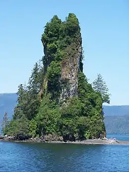 The volcano rises from the bottom of Behm Canal, about 850 feet (260 m) below sea level.[3] The island stands to 237 feet (72 m) above sea level, giving the volcano a total height of over 1,000 feet (300 m). While the portion of the volcano below sea level is somewhat cone-shaped, wave action over the millennia has eroded all the rock above sea level except the dense, spire-shaped volcanic plug.[1]