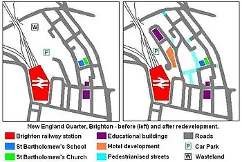 Various proposals were put forward for more effective use of the land. The first was in 1989, when a mixed-use development, centred on a new pedestrianised square outside St Bartholomew's Church, was planned. It would have included a supermarket, offices, houses and other shops, and a relief road designed to take traffic away from the congested London Road.[5] The Environmental Services Department of what was then Brighton Borough Council produced a planning brief for the site in October 1993, stating a desire to "recreate in the area west of London Road a vital, urban, mixed use townscape which links a regenerated and environmentally enhanced London Road shopping centre with North Laine and the station".[9] The desire to use the site to its full potential was increased when city status was awarded to Brighton and Hove in 2000; it was the largest brownfield site in the city.[10]
