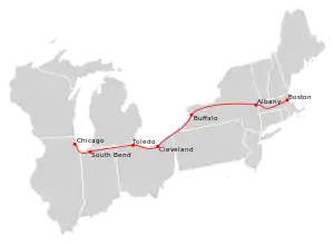The New England States was a passenger train operated by the New York Central Railroad and its successor Penn Central over the Water Level Route (predominantly alongside rivers and lake shores) between Chicago and Boston. It was launched in 1938, in tandem with the relaunch of the newly-streamlined 20th Century Limited, and assumed responsibility for that train's Boston sleepers. In 1949 it became the first Chicago–Boston streamliner. The New York Central dropped the name in 1967; an unnamed remnant continued running until 1971. Amtrak's Lake Shore Limited now serves the route.