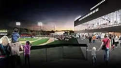 New Hudson Ballpark is the temporary name for a proposed ballpark to be built in Hudson, Wisconsin. It is planned to be the home of the St. Croix River Hounds, a collegiate summer baseball team that will play in the Northwoods League.[3] The new stadium will be part of a multi-use campus planned for the old 130-acre St. Croix Meadows dog track,[3][4] a facility which was in business from 1991 to 2001, and which was unused afterwards.[5] It was reported in July 2017 that construction could start the next month, with ticket sales starting that September and the stadium opening in May 2018.[6] The St. Croix Meadows dog track was demolished in January 2018 to make room for the new Hudson Gateway development.[7] In October 2019, baseball stadium construction was set to begin in the spring of 2020.[3] In May 2020, construction was to begin "this summer".[8] As of April 29, 2021, ballpark construction had not begun, but the team still had "the intention to begin the build this year."[9] In July 2022, a revised development plan was presented that would call for a 1,400 seat facility that could open as soon as June 2023.[2] The River Hounds were still not listed in the Northwoods League schedule for 2023.[10]