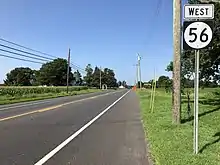 The portion of Route 56 in Vineland was built as a 100-foot (30 m) wide road when Vineland was planned in the 1860s, serving as the main east–west road through the community.[4] In 1938, two separate roads numbered Route 56 were legislated. One was located in Ocean County and was to run from the Laurelton Circle east to Mantoloking; this road was never built.[5] The other was located in the Atlantic City area along U.S. Route 30 (Absecon Boulevard) east of current Route 157; the Route 56 designation on this road was dropped in the 1953 New Jersey state highway renumbering.[6] What is modern-day Route 56 was originally designated as County Route 22 between Route 77 and the Salem County border, County Route 6 in Salem County, and County Route 23 between the Salem County border and Route 47.[7][8] In 1977, Route 56 was legislated onto its current alignment between Route 77 in Upper Deerfield Township and Route 47 in Vineland, replacing County Routes 6, 22, and 23.[8] The route was designated in October 1983.[2]