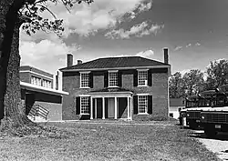 The original campus of 1795 consisted of a two-story, frame building with a hipped roof, interior end chimneys, and enlarged windows. The structure was built in Greek Revival style.[4] There was also a president's house, a large enclosed brick church, and a kitchen. As well as a Smokehouse. Nothing is left of the Smokehouse today.[5] Later in 1839, the original academy building was replaced by an exact copy of the original, now known as Alumni Hall, exept it was made of brick instead of frame.[6] It was listed on the National Register of Historic Places in 1972. It also used to be connected to Thomas Hall, as described below.[7]