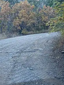 East of Placitas, NM the road turns south goes up Las Huertas Canyon, becoming an unpaved, bumpy road that is one of the two last roads to be plowed in the winter.[3]