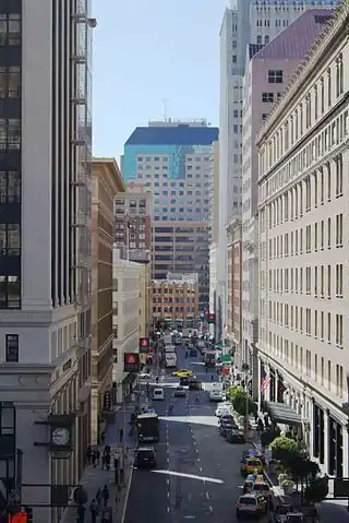 Before New Montgomery Street was created, an inner street called Jane Street ran parallel to Second and Third Street.[1] In the 1870s, Montgomery Street South was established in its place as the southern extension of Montgomery Street, one of the main thoroughfares in San Francisco's Financial District, running north from Market to Telegraph Hill. The extension was strongly supported by businessman and Bank of California founder William Ralston – who started the construction of the original Palace Hotel, at the time the largest hotel in the Western United States – in an effort to expand San Francisco's business district to the yet undeveloped area south of Market.[2][3] Ralston's original plans to connect Montgomery Street to the waterfront failed due to the unwillingness of two property owners (governor Milton Latham and shipping baron John Parrott) to sell their mansions on Rincon Hill, which is why Montgomery Street South never got past Howard Street.[4][5]