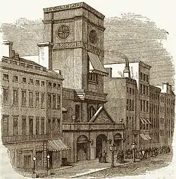 ![]() 1868 drawing of a street scene in front of the altered but recognizable exterior of the church | |