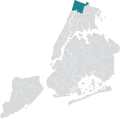District 11 is based in the far northwest corner of the Bronx, covering all of Riverdale, Norwood, Van Cortlandt Village, and Woodlawn, and parts of Wakefield, Bedford Park, and Kingsbridge.[4] Van Cortlandt Park, the city's third-largest park, is located within the district.
