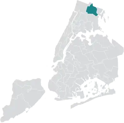 District 12 covers the farthest northeastern neighborhoods of the Bronx, including all of Williamsbridge, Baychester, Co-op City, and Eastchester as well as part of Wakefield.[4]