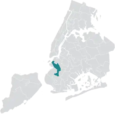 District 39 is based in the Brooklyn neighborhood of Park Slope, also stretching west and south to cover Gowanus, Cobble Hill, Carroll Gardens, Columbia Waterfront, and parts of Windsor Terrace, Borough Park, and Kensington.[4] Most of Prospect Park proper is also located within the district.