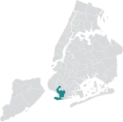 The district overlaps with Brooklyn Community Boards 11, 13, and 15, and with New York's 8th, 10th, and 11th congressional districts. It also overlaps with the 17th, 22nd, and 23rd districts of the New York State Senate, and with the 45th, 46th, 47th, 48th, and 49th districts of the New York State Assembly.[5]