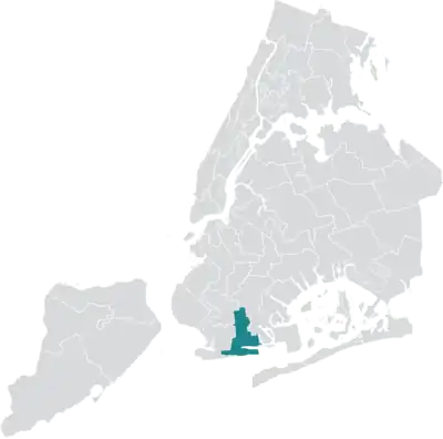 The district overlaps with Brooklyn Community Boards 13, 14, and 15, and with New York's 8th, 9th, and 11th congressional districts. It also overlaps with the 17th, 19th, 22nd, and 23rd districts of the New York State Senate, and with the 41st, 42nd, 45th, 46th, and 48th districts of the New York State Assembly.[5]