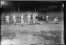 It is said that after one particularly satisfying victory over the Philadelphia Phillies, Mutrie (who was also the team's manager) stormed into the dressing room and exclaimed, "My big fellows! My giants!"[5] From then on (1885), the club was known as the Giants. However, more recent research has suggested that the New York World was already widely using the Giants nickname throughout the 1885 season, before the legendary game was played.[6]