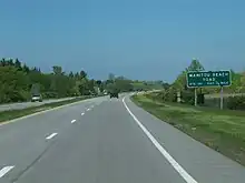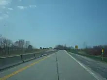 The Lake Ontario State Parkway begins at an interchange with Lakeside Beach Road in Lakeside Beach State Park, located within the town of Carlton in north-central Orleans County.[7] It heads eastward as part of the Seaway Trail, which enters the area from the west on NY 18 and turns north onto Lakeside Beach Road to access the parkway.[8] The four-lane freeway exits the park and enters an area dominated by open, cultivated fields, where it skirts the southern edge of Oak Orchard State Marine Park, a small park situated at the mouth of the Oak Orchard River. Not far to the east, the parkway crosses the river itself and connects to the northern terminus of NY 98 by way of an interchange.[7]