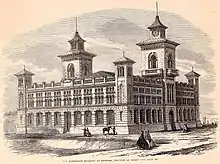 A low-level site on King Street was secured and a contract was let to Messrs. George Cornwell and Edward Horsman on November 11, 1863 for £10,250 to erect the Main Building. There was a large two-story stone Italianate building with clock tower and a series of annexes all designed by Mason and Clayton,[6] with a central courtyard derived from Fowler's design of Covent Garden market.[7] It was not completely finished when the fair opened.[6]
