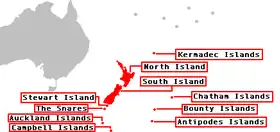 Eight island groups sit on the New Zealand continental shelf, which forms a part of Zealandia. The Kermadec Islands, northeast of mainland New Zealand, are on a ridge, whose location as part or not part of Zealandia is not yet proven by geologists.[1][2] Both sources show a map drawn of Zealandia, marking the location of islands north and south of New Zealand.