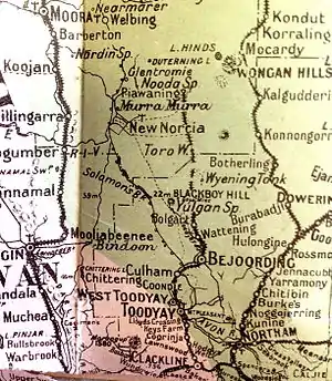 - ↑ "THE NEWCASTLE-BOLGART RAILWAY". The West Australian. Perth: National Library of Australia. 6 November 1906. p. 6. Retrieved 8 February 2014.