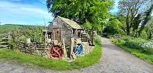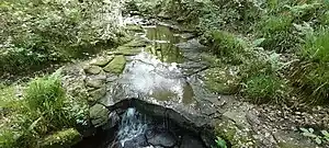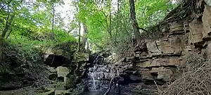Veering south west off Fine Lane and past local landmark, the Swinging Cat microbar, is a footpath running parallel to then crossing a stream known as Small Burn.[4] Two waterfalls can be found on this stream. The first is hidden in the trees at the top of a gorge on the edge of Newlands (note this can be dangerous to access when the stream is in flood). The second can be found a further 150 m further on where the footpath crosses Small Burn over a stone bridge.