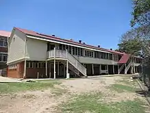 Instead, in 1954 a timber Boulton & Paul Building was constructed, comprising two classrooms (now called Block B).[69][70] Responding to materials shortages and the pressures of the baby boom, the Department of Public Works imported a British prefabricated building system from manufacturers Boulton & Paul Ltd of Norwich. Based on an 8-foot (2.4 m) planning and construction module, the prefabricated elements in the Boulton & Paul system included wall panels, ceiling panels, roof trusses and banks of awning windows. The buildings were constructed at many schools across Queensland between 1952 and 1958.[71][72] Boulton & Paul buildings were timber-framed and clad, had a verandah as circulation, and a gable roof. Ideally, they were orientated so the verandah faced north and the classroom faced south but were also added as extensions to existing buildings regardless of orientation. The building could be high or low-set and had extensive areas of timber framed awning windows, providing more glazing than had ever been used in Queensland classrooms; almost the entirety of the verandah wall and the opposite classroom wall were glazed, providing excellent natural ventilation and lighting. The classrooms were 24 by 24 feet (7.3 m × 7.3 m), larger than most previous classrooms.[73] The flexibility of the system meant that the number of classrooms constructed could vary to suit the needs of a particular school. In some cases, Boulton & Paul classrooms were used to form long, interconnected blocks, such as at Geebung State School (1951–55), Dalby State High School (1954) and Indooroopilly State High School (1953-54).[74][75][76][1]