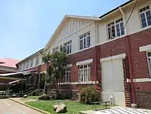 Newmarket State School's new brick school building (now called Block A) was opened on 30 June 1934 by the Minister for Public Instruction (Frank Cooper).[50] It was a two-storey masonry building, constructed from red brick with a darker brick base and pale stucco treatment to the upper floor. It had a hipped roof with gables over the entrances and a prominent ventilation fleche. The main entrance was through a portico with three round arches. Gables featured a half-timbered ornamental effect, utilising timber, fibre-cement panels and terracotta tiles. The building contained 13 classrooms, a head teacher's office, and retiring rooms on both floors. Circulation was provided by an internal staircase at the eastern end and an external timber staircase attached to the western wall. Windows on the southern elevation were protected by terra-cotta tile-clad window hoods. Landscaping in front of the new building including a row of fig trees along the Banks Street fence line (two of which survive), and the laying out of pathways.[51][49][1]