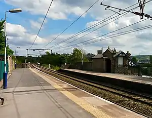 The station was opened by the Sheffield, Ashton-Under-Lyne and Manchester Railway as "Newton and Hyde" in 1841, however the station signage referred to the station as "Newton". Trains originally ran from Manchester[3] to Sheffield[4] on the Woodhead Line, with a rail yard immediately to the south bounded by Sheffield Road, the remains of a covered shed being visible on the Westbound platform.[5] The line was electrified in 1953 and closed to passengers between Hadfield and Penistone in 1970.[6] Following the privatisation of train services in 1997, the route was operated by First North Western until 2004 and then Northern Rail,[7] whose franchise was extended until February 2016.[8] Services were taken over by and ran Northern from April 2016 to February 2020. Services are now run by Northern Trains who took over running services in March 2020. The official name on tickets is "Newton for Hyde" to avoid confusion with Newton (South Lanarkshire) and from July 2007 new signage was installed with the legend 'Newton For Hyde'.