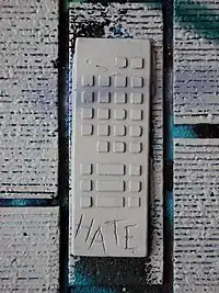 - The concrete graffiti style uses objects cast in concrete or a similar material, which are often glued into place on a footpath or against a wall. Around Newtown, many of these objects appear to have been created by the same artist, Will Coles, as a commentary on consumer culture. They have often been in the form of familiar items such as televisions and TV remote controls, and feature inscribed single-word slogans such as "fear" or "hate". These largest of these objects are the installations on King Street and on the corner of Gladstone Street, Enmore; both are full-scale replicas of a medium-size CRT television mounted on top of a replica VCR. The King Street object (now defaced by marker tags) is inscribed with the slogan "life is fleeting" and the Gladstone Street object with the word "obsolescence". Other concrete graffiti objects (such as those pictured above in May Street, St Peters) are partial representations of human-like faces, which appear to be based on medieval gargoyles.[16][17]