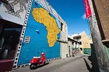 The "Africa" mural in King Street was originally painted in the early 1990s. The large work occupies the entire side wall of an African restaurant, located between the Newtown Mission and the Commonwealth Bank. The first version was reproduced from an old map printed by the Australian firm Chas. Scally & Co., most likely dating from the 1960s. The current version, painted over the original in the early 2000s, reflects the major changes in African political geography in the recent times.