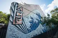 One of the largest and longest-lasting Newtown murals is the "Great Wave" mural, painted on the side of a house located at the corner of Munni Street and Gowrie Street in south Newtown. Created in 2000, it features a striking combination of elaborate 3D style abstract pieces and pictorial images on a Japanese theme, including a huge image of a breaking wave rendered in the style of the famous Hokusai woodcut The Great Wave Off Kanagawa. The work is credited to artists "DAYS", "DMOTE", "PUDL" and "SNARL", members of the street art collective "Big City Freaks" (BCF), whose initials can be seen on the far right of the Great Wave mural. In October 2009 members of this group rendered a new mural along the rear wall of the Ausscrap building, facing Wilford Street.