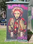 Since the 1980s, the area surrounding the Sydney inner west suburb of Newtown, Australia, including the suburbs of Newtown, Enmore, Erskineville, Camperdown and St Peters, has been known for its wide range of prominent graffiti and street art on walls. [1] The public visual art in the Newtown area consists of a variety of styles and methods of execution, including large-scale painted murals, hand-painted (or sprayed) political slogans, hand-painted figurative designs, spray painted semi-abstract designs (including large-scale and elaborate semi-pictorial) "tags"), and other stylistic developments such as stencil art and street poster art (also known as "wheatpasting"), "Yarn bombing", and sculptural items cast from plaster and other materials.[2]