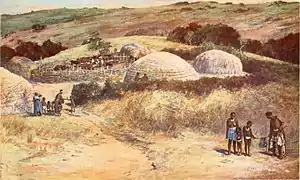 Most of what is believed about ancient Nguni history comes from oral history and legends. Traditionally, their partial ancestors are said to have migrated to Africa's Great Lakes region from the north.[3] According to linguistic evidence and historians (including John H. Robertson, Rebecca Bradley, T. Russell, Fabio Silva, and James Steele), some of the ancestors of the Nguni people migrated from west of the geographic centre of Africa[4] towards modern-day South Africa 7000 years ago (5000 BC).[5][6][7][8] Nguni ancestors had migrated within South Africa to KwaZulu-Natal by the 1st century AD and were also present in the Transvaal region at the same time.[9][10][11][12] These partially nomadic ancestors of the modern Nguni people brought with them sheep, cattle, goats, and horticultural crops, many of which had never been used in South Africa at that time.[13][10]
