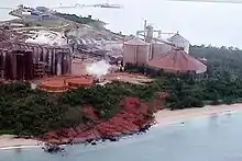 Nhulunbuy's population had already dropped by mid 2014, with some of the workforce retained to monitor the shutdown and survey holding ponds full of toxic compounds, but most will be gone by January 2015.[2] A range of measures were announced to support the town and its former workers through the closure and the following three years, but locals anticipate further cuts to services since the school, hospital, power plant and flights were backed by Rio Tinto.[15] The closure of the refinery also left flights on the Darwin-Nhulunbuy route to fall to around 50 to 60 per cent full, causing QantasLink to suspend flights on the route from 17 August 2014.[16]