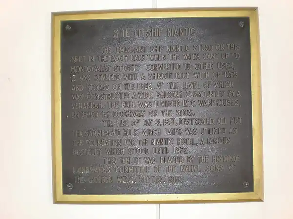 Niantic was a whaleship that brought fortune-seekers to Yerba Buena (later renamed San Francisco) during the California Gold Rush of 1849. Run aground and converted into a storeship and hotel, she was a prominent landmark in the booming city for several years. The site of Niantic beside the Transamerica Pyramid is now a California Historical Landmark. Artifacts excavated in 1978 and the ship's log from her last voyage are on display in the San Francisco Maritime Museum.