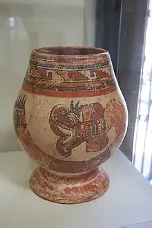The Nicarao are believed to be descendants of migrating Toltecs.[10][11][12] The Nicarao migrated from North America and central and southern Mexico over the course of several centuries from approximately 700 CE onwards.[13] However there is also evidence to suggest that this branch of the Nahua originated in Chiapas and the Yucatan, most likely descended from Toltec invaders of Chichen Itza.[14][15][16][17] Around 1200 CE, the Nicarao split from the Pipil people and moved into what is now Nicaragua.[18] The migration of the Nicarao has been linked to the collapse of the important central-Mexican cities of Teotihuacan and Tula, as well as the Classic Maya collapse. The Nicarao settled throughout western Nicaragua, such as Rivas, Jinotega, Chinandega, Nueva Segovia, Tiger Lagoon, Lake Xolotlan, Lake Nicaragua, Ometepe Island, Matagalpa, Esteli, and parts of Leon, Granada and Managua.[19][20][21][22][23] The Nicarao also settled in Bagaces, Costa Rica after kicking out the Huetar people that were already there, resulting in tribal warfare between the Nahuas and the Huetares which lasted over a century.[24][25] As a Mesoamerican group, the Nicarao shared many blended cultural traits with both indigenous North American and Mexican belief systems as well as their Toltec parent tribe, including an identical Toltec calendar, similar organizational treaties, the use of screenfold books, the worship of the Great Spirit and closely related sky deities, Nagual mysticism, the practice of animal and Tonal spirituality, and expertise in medical practice.[26][27][28][29][30]