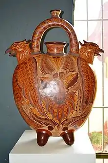 Pajarito Gonzalez has worked with clay most of his life, with a career of over fifty years. He works in the regional styles of bruñido and canelo, but is particularly renowned for the latter.[1][2][3] He continues to run his own workshop with his children Zenón and Isabel, who learned the craft from him, producing platters, large covered jars called tibores, jugs, dispensers in the form of bulls and horses. The last are unique to the workshop.[1][2]