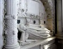His monument on the north side of the chancel of Bovey Tracey Church is believed to have been made by the Exeter sculptor John Deymond[33] who is recorded in the List of Freemen of the City of Exeter in 1597 as the apprentice of Richard Deymond. The monument has the "blunt inscription" 1620 ID on an otherwise blank panel above the effigy, and is similar in many respects to the monument to Sir John Acland (1552–1620) in Broadclyst church, also thought to have been made by John Deymond.[34]