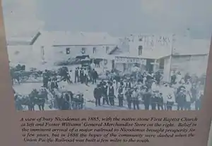 By the mid-1880s Nicodemus was a small, bustling town. There were two newspapers, three general stores and at least three churches. The town had a number of small hotels, an ice cream parlor, bank, livery and a number of homes. The population was an estimated 700 at the town's heyday.
