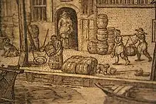 Detail of a grisaille painting of the family brewery called De Drie Lelien, by Jacob Matham in 1627. It could be either Nicolaes or his father standing in the doorway.