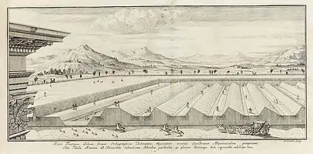 Engraving for a work published by Nicolas Fatio de Duillier in 1699, describing his invention of sloping fruit walls, intended to collect heat from sunlight and thus to promote plant growth.